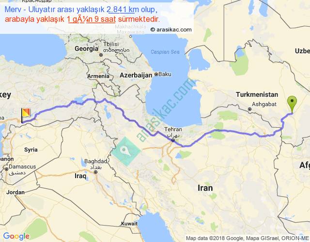Merv - Uluyatır arası yaklaşık olarak 90 km/h ile yukarıda belirtilen sürede olup, iki yerin kuş uçuşu uzaklığı (mesafesi) 2148'dir. Eğer belirtilen yerler arasında uçak seferi var ise bu süre uçakla 3 saat 18 dakika'ya kadar düşebilir. Yolculuk otobüsle 1 gün 18 saat sürmektedir.