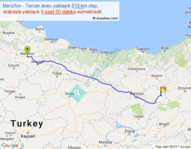 Merzifon - Tercan arası yaklaşık olarak 90 km/h ile yukarıda belirtilen sürede olup, iki yerin kuş uçuşu uzaklığı (mesafesi) 432'dir. Eğer belirtilen yerler arasında uçak seferi var ise bu süre uçakla 39 dakika'ya kadar düşebilir. Yolculuk otobüsle 7 saat 35 dakika sürmektedir.