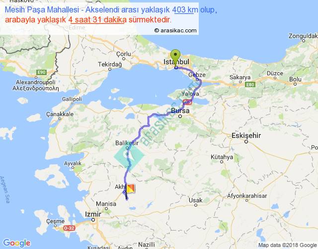 Mesih Paşa Mahallesi - Akselendi arası yaklaşık olarak 90 km/h ile yukarıda belirtilen sürede olup, iki yerin kuş uçuşu uzaklığı (mesafesi) 263'dir. Eğer belirtilen yerler arasında uçak seferi var ise bu süre uçakla 24 dakika'ya kadar düşebilir. Yolculuk otobüsle 5 saat 52 dakika sürmektedir.