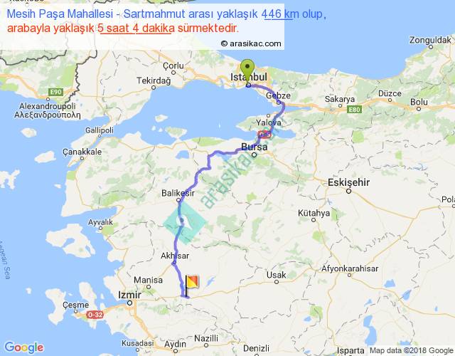 Mesih Paşa Mahallesi - Sartmahmut arası yaklaşık olarak 90 km/h ile yukarıda belirtilen sürede olup, iki yerin kuş uçuşu uzaklığı (mesafesi) 289'dir. Eğer belirtilen yerler arasında uçak seferi var ise bu süre uçakla 26 dakika'ya kadar düşebilir. Yolculuk otobüsle 6 saat 35 dakika sürmektedir.