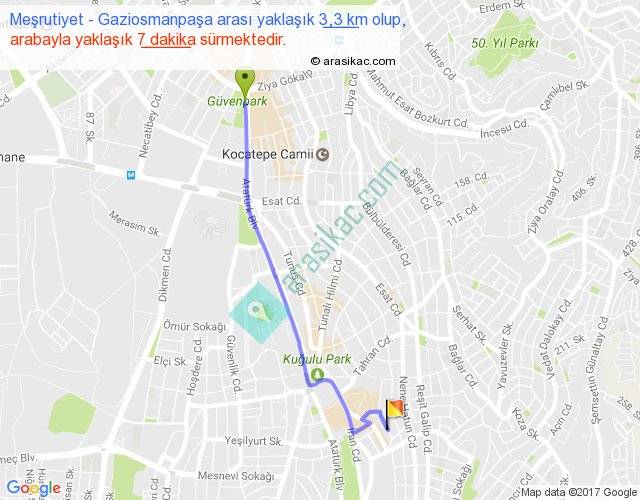 Meşrutiyet - Gaziosmanpaşa arası yaklaşık olarak 90 km/h ile yukarıda belirtilen sürede olup, iki yerin kuş uçuşu uzaklığı (mesafesi) 3'dir. Yolculuk otobüsle 9 dakika sürmektedir.
