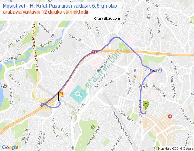 Meşrutiyet - H. Rıfat Paşa arası yaklaşık olarak 90 km/h ile yukarıda belirtilen sürede olup, iki yerin kuş uçuşu uzaklığı (mesafesi) 2'dir. Yolculuk otobüsle 15 dakika sürmektedir.