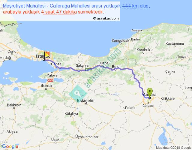 Meşrutiyet Mahallesi - Caferağa Mahallesi arası yaklaşık olarak 90 km/h ile yukarıda belirtilen sürede olup, iki yerin kuş uçuşu uzaklığı (mesafesi) 343'dir. Eğer belirtilen yerler arasında uçak seferi var ise bu süre uçakla 31 dakika'ya kadar düşebilir. Yolculuk otobüsle 6 saat 13 dakika sürmektedir.