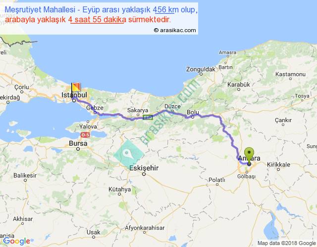 Meşrutiyet Mahallesi - Eyüp arası yaklaşık olarak 90 km/h ile yukarıda belirtilen sürede olup, iki yerin kuş uçuşu uzaklığı (mesafesi) 353'dir. Eğer belirtilen yerler arasında uçak seferi var ise bu süre uçakla 32 dakika'ya kadar düşebilir. Yolculuk otobüsle 6 saat 23 dakika sürmektedir.