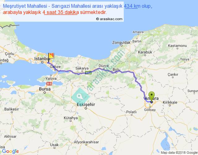 Meşrutiyet Mahallesi - Sarıgazi Mahallesi arası yaklaşık olarak 90 km/h ile yukarıda belirtilen sürede olup, iki yerin kuş uçuşu uzaklığı (mesafesi) 330'dir. Eğer belirtilen yerler arasında uçak seferi var ise bu süre uçakla 30 dakika'ya kadar düşebilir. Yolculuk otobüsle 5 saat 57 dakika sürmektedir.