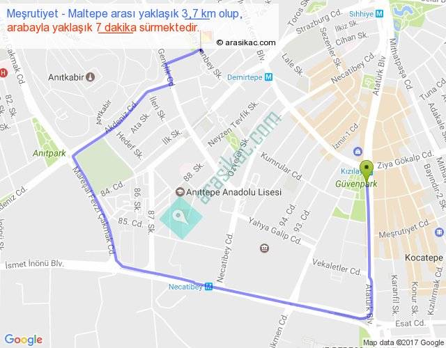 Meşrutiyet - Maltepe arası yaklaşık olarak 90 km/h ile yukarıda belirtilen sürede olup, iki yerin kuş uçuşu uzaklığı (mesafesi) 1'dir. Yolculuk otobüsle 9 dakika sürmektedir.