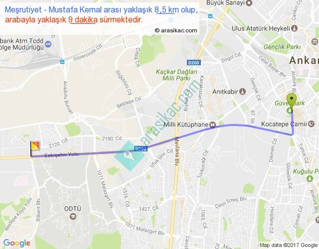 Meşrutiyet - Mustafa Kemal arası yaklaşık olarak 90 km/h ile yukarıda belirtilen sürede olup, iki yerin kuş uçuşu uzaklığı (mesafesi) 8'dir. Yolculuk otobüsle 11 dakika sürmektedir.