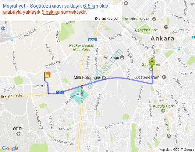 Meşrutiyet - Söğütözü arası yaklaşık olarak 90 km/h ile yukarıda belirtilen sürede olup, iki yerin kuş uçuşu uzaklığı (mesafesi) 5'dir. Yolculuk otobüsle 11 dakika sürmektedir.