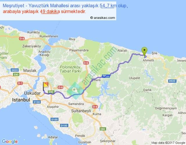Meşrutiyet - Yavuztürk Mahallesi arası yaklaşık olarak 90 km/h ile yukarıda belirtilen sürede olup, iki yerin kuş uçuşu uzaklığı (mesafesi) 42'dir. Yolculuk otobüsle 1 saat 3 dakika sürmektedir.