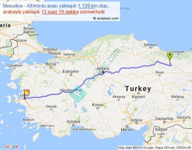 Mesudiye - Altınordu arası yaklaşık olarak 90 km/h ile yukarıda belirtilen sürede olup, iki yerin kuş uçuşu uzaklığı (mesafesi) 935'dir. Eğer belirtilen yerler arasında uçak seferi var ise bu süre uçakla 1 saat 26 dakika'ya kadar düşebilir. Yolculuk otobüsle 17 saat 18 dakika sürmektedir.