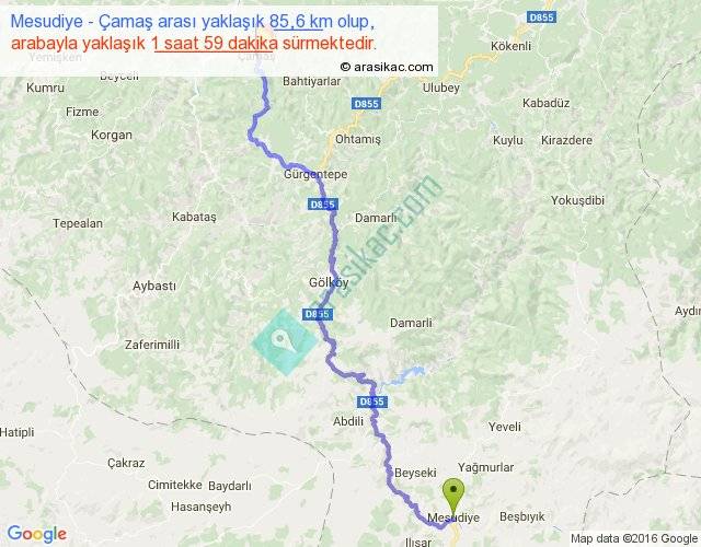 Mesudiye - Çamaş arası yaklaşık olarak 90 km/h ile yukarıda belirtilen sürede olup, iki yerin kuş uçuşu uzaklığı (mesafesi) 53'dir. Yolculuk otobüsle 2 saat 34 dakika sürmektedir.