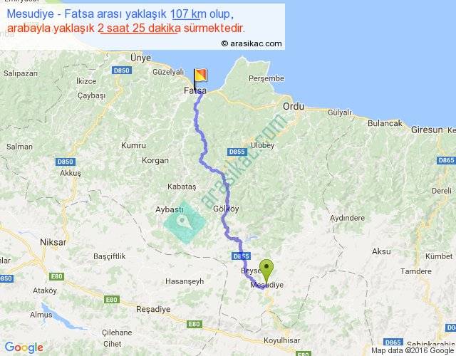 Mesudiye - Fatsa arası yaklaşık olarak 90 km/h ile yukarıda belirtilen sürede olup, iki yerin kuş uçuşu uzaklığı (mesafesi) 67'dir. Yolculuk otobüsle 3 saat 8 dakika sürmektedir.
