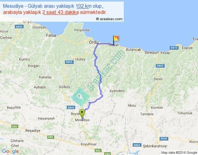 Mesudiye - Gülyalı arası yaklaşık olarak 90 km/h ile yukarıda belirtilen sürede olup, iki yerin kuş uçuşu uzaklığı (mesafesi) 60'dir. Yolculuk otobüsle 3 saat 31 dakika sürmektedir.