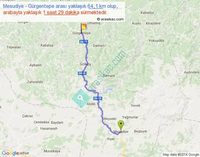 Mesudiye - Gürgentepe arası yaklaşık olarak 90 km/h ile yukarıda belirtilen sürede olup, iki yerin kuş uçuşu uzaklığı (mesafesi) 39'dir. Yolculuk otobüsle 1 saat 55 dakika sürmektedir.