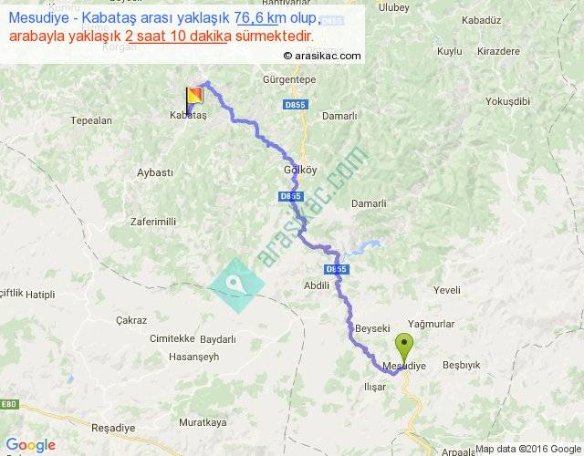 Mesudiye - Kabataş arası yaklaşık olarak 90 km/h ile yukarıda belirtilen sürede olup, iki yerin kuş uçuşu uzaklığı (mesafesi) 42'dir. Yolculuk otobüsle 2 saat 49 dakika sürmektedir.