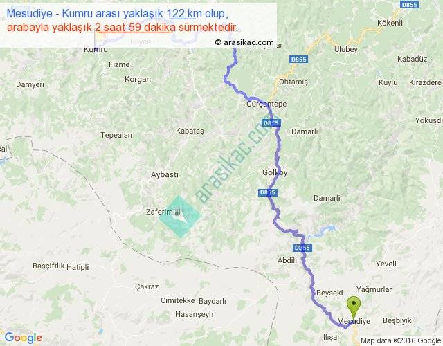 Mesudiye - Kumru arası yaklaşık olarak 90 km/h ile yukarıda belirtilen sürede olup, iki yerin kuş uçuşu uzaklığı (mesafesi) 62'dir. Yolculuk otobüsle 3 saat 52 dakika sürmektedir.
