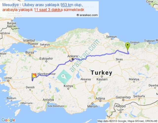 Mesudiye - Ulubey arası yaklaşık olarak 90 km/h ile yukarıda belirtilen sürede olup, iki yerin kuş uçuşu uzaklığı (mesafesi) 758'dir. Eğer belirtilen yerler arasında uçak seferi var ise bu süre uçakla 1 saat 09 dakika'ya kadar düşebilir. Yolculuk otobüsle 14 saat 21 dakika sürmektedir.
