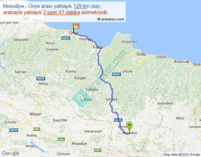 Mesudiye - Ünye arası yaklaşık olarak 90 km/h ile yukarıda belirtilen sürede olup, iki yerin kuş uçuşu uzaklığı (mesafesi) 84'dir. Yolculuk otobüsle 3 saat 37 dakika sürmektedir.