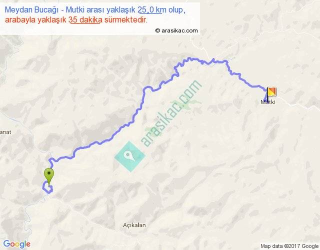 Meydan Bucağı - Mutki arası yaklaşık olarak 90 km/h ile yukarıda belirtilen sürede olup, iki yerin kuş uçuşu uzaklığı (mesafesi) 14'dir. Yolculuk otobüsle 45 dakika sürmektedir.