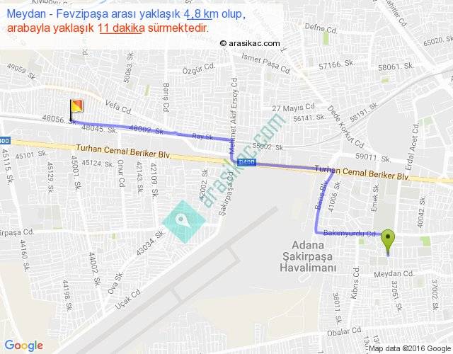 Meydan - Fevzipaşa arası yaklaşık olarak 90 km/h ile yukarıda belirtilen sürede olup, iki yerin kuş uçuşu uzaklığı (mesafesi) 4'dir. Yolculuk otobüsle 14 dakika sürmektedir.