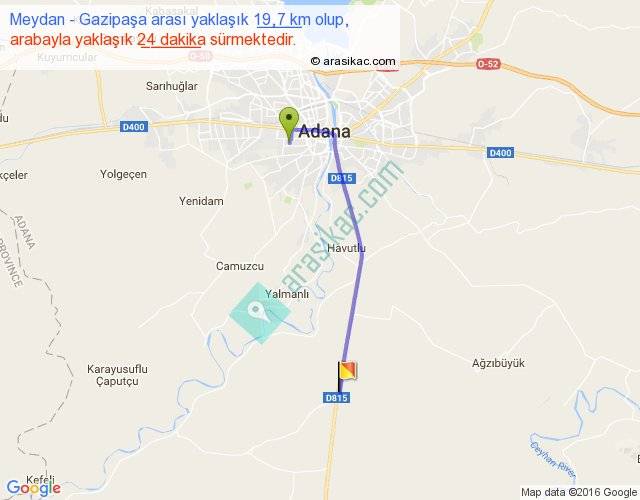 Meydan - Gazipaşa arası yaklaşık olarak 90 km/h ile yukarıda belirtilen sürede olup, iki yerin kuş uçuşu uzaklığı (mesafesi) 15'dir. Yolculuk otobüsle 31 dakika sürmektedir.