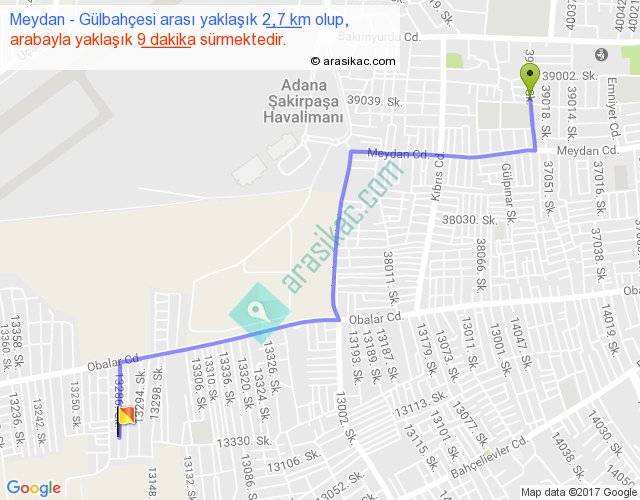 Meydan - Gülbahçesi arası yaklaşık olarak 90 km/h ile yukarıda belirtilen sürede olup, iki yerin kuş uçuşu uzaklığı (mesafesi) 2'dir. Yolculuk otobüsle 11 dakika sürmektedir.