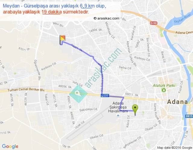 Meydan - Gürselpaşa arası yaklaşık olarak 90 km/h ile yukarıda belirtilen sürede olup, iki yerin kuş uçuşu uzaklığı (mesafesi) 5'dir. Yolculuk otobüsle 24 dakika sürmektedir.