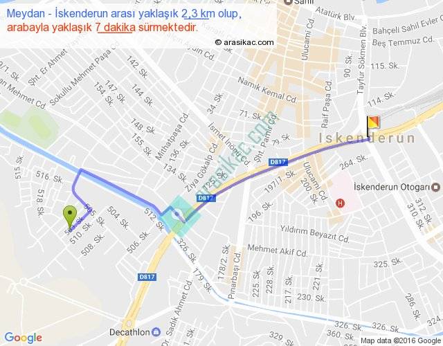 Meydan - İskenderun arası yaklaşık olarak 90 km/h ile yukarıda belirtilen sürede olup, iki yerin kuş uçuşu uzaklığı (mesafesi) 2'dir. Yolculuk otobüsle 9 dakika sürmektedir.
