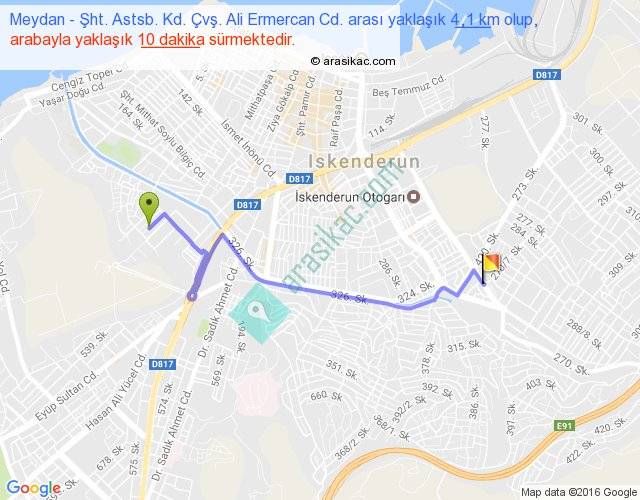 Meydan - Şht. Astsb. Kd. Çvş. Ali Ermercan Cd. arası yaklaşık olarak 90 km/h ile yukarıda belirtilen sürede olup, iki yerin kuş uçuşu uzaklığı (mesafesi) 3'dir. Yolculuk otobüsle 13 dakika sürmektedir.
