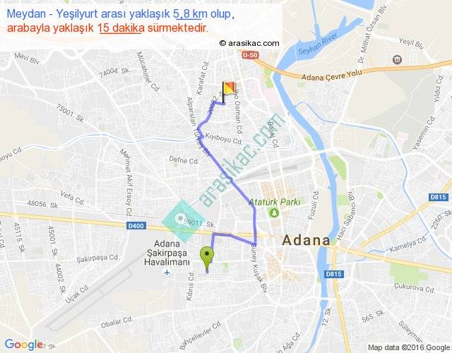 Meydan - Yeşilyurt arası yaklaşık olarak 90 km/h ile yukarıda belirtilen sürede olup, iki yerin kuş uçuşu uzaklığı (mesafesi) 4'dir. Yolculuk otobüsle 19 dakika sürmektedir.