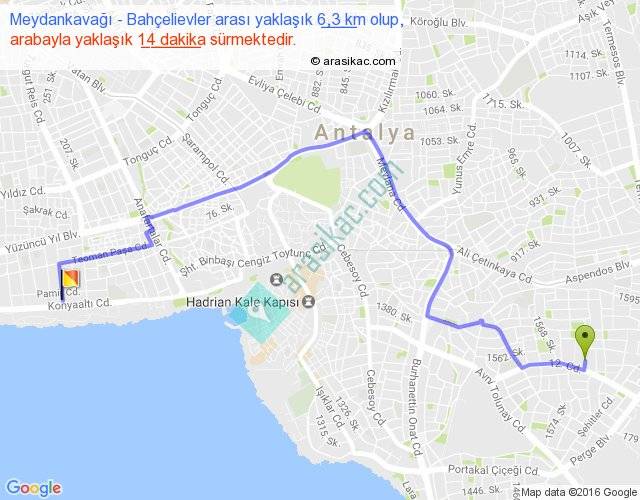 Meydankavağı - Bahçelievler arası yaklaşık olarak 90 km/h ile yukarıda belirtilen sürede olup, iki yerin kuş uçuşu uzaklığı (mesafesi) 4'dir. Yolculuk otobüsle 18 dakika sürmektedir.