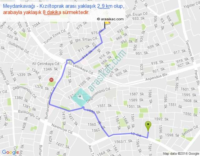 Meydankavağı - Kızıltoprak arası yaklaşık olarak 90 km/h ile yukarıda belirtilen sürede olup, iki yerin kuş uçuşu uzaklığı (mesafesi) 1'dir. Yolculuk otobüsle 10 dakika sürmektedir.