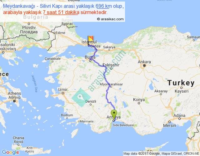Meydankavağı - Silivri Kapı arası yaklaşık olarak 90 km/h ile yukarıda belirtilen sürede olup, iki yerin kuş uçuşu uzaklığı (mesafesi) 482'dir. Eğer belirtilen yerler arasında uçak seferi var ise bu süre uçakla 44 dakika'ya kadar düşebilir. Yolculuk otobüsle 10 saat 12 dakika sürmektedir.