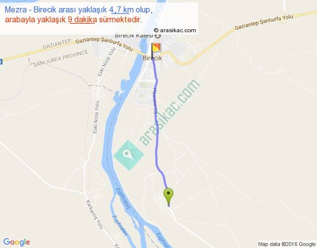 Mezra - Birecik arası yaklaşık olarak 90 km/h ile yukarıda belirtilen sürede olup, iki yerin kuş uçuşu uzaklığı (mesafesi) 5'dir. Yolculuk otobüsle 11 dakika sürmektedir.