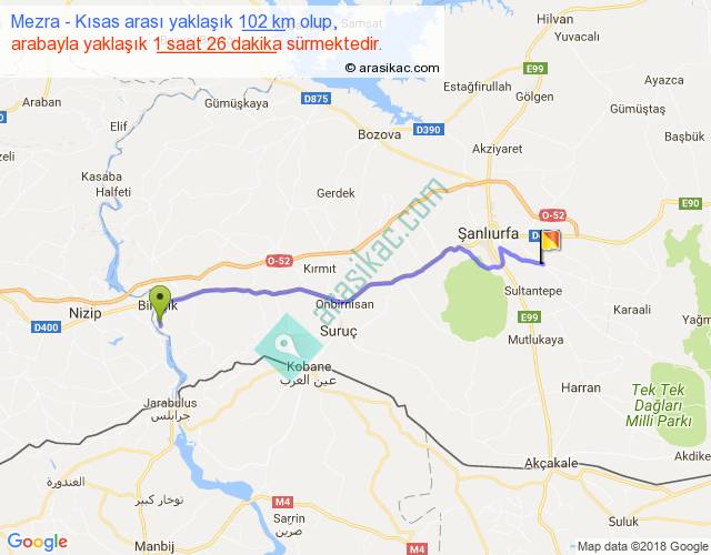 Mezra - Kısas arası yaklaşık olarak 90 km/h ile yukarıda belirtilen sürede olup, iki yerin kuş uçuşu uzaklığı (mesafesi) 84'dir. Yolculuk otobüsle 1 saat 51 dakika sürmektedir.
