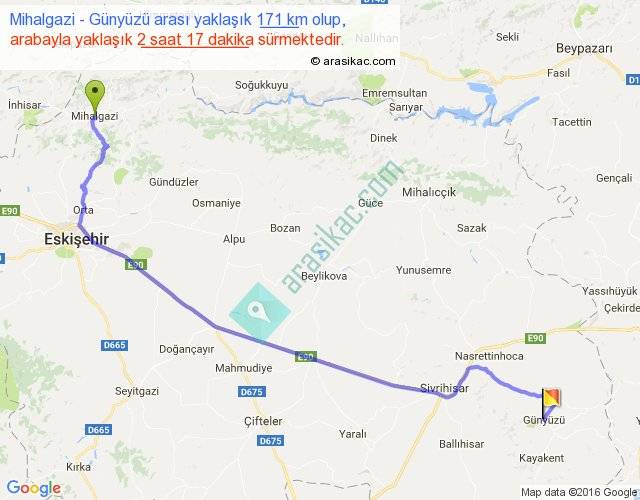 Mihalgazi - Günyüzü arası yaklaşık olarak 90 km/h ile yukarıda belirtilen sürede olup, iki yerin kuş uçuşu uzaklığı (mesafesi) 127'dir. Yolculuk otobüsle 2 saat 58 dakika sürmektedir.