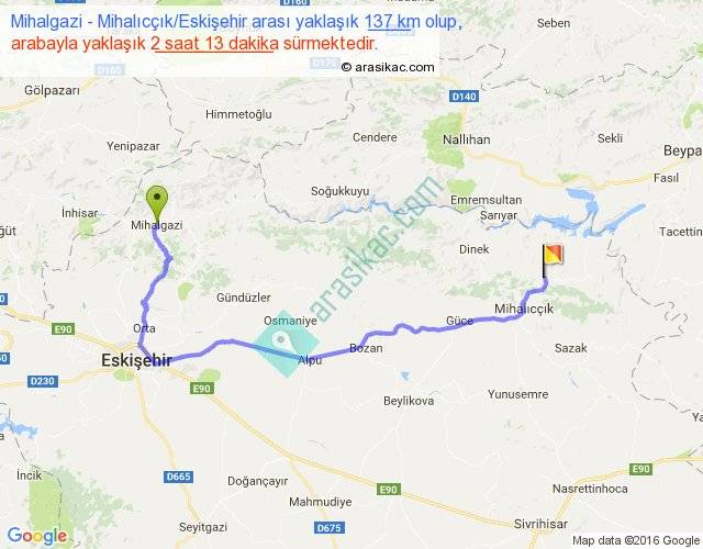 Mihalgazi - Mihalıcçık Eskişehir arası yaklaşık olarak 90 km/h ile yukarıda belirtilen sürede olup, iki yerin kuş uçuşu uzaklığı (mesafesi) 83'dir. Yolculuk otobüsle 2 saat 52 dakika sürmektedir.