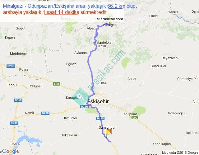 Mihalgazi - Odunpazarı Eskişehir arası yaklaşık olarak 90 km/h ile yukarıda belirtilen sürede olup, iki yerin kuş uçuşu uzaklığı (mesafesi) 43'dir. Yolculuk otobüsle 1 saat 36 dakika sürmektedir.