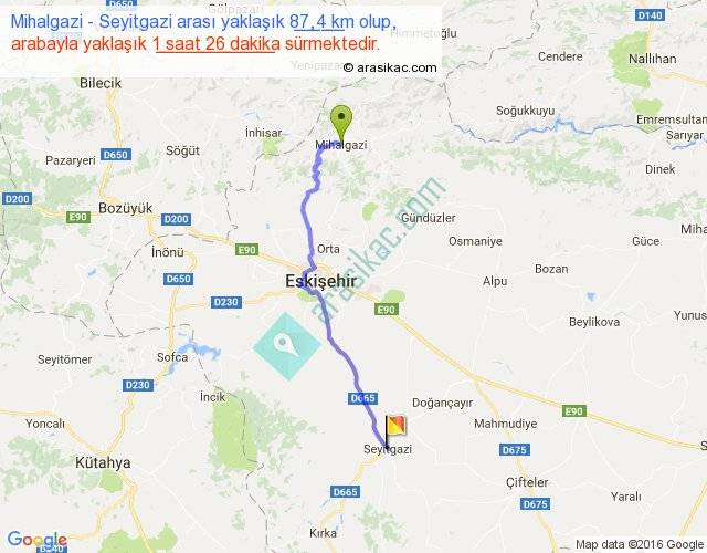 Mihalgazi - Seyitgazi arası yaklaşık olarak 90 km/h ile yukarıda belirtilen sürede olup, iki yerin kuş uçuşu uzaklığı (mesafesi) 65'dir. Yolculuk otobüsle 1 saat 51 dakika sürmektedir.