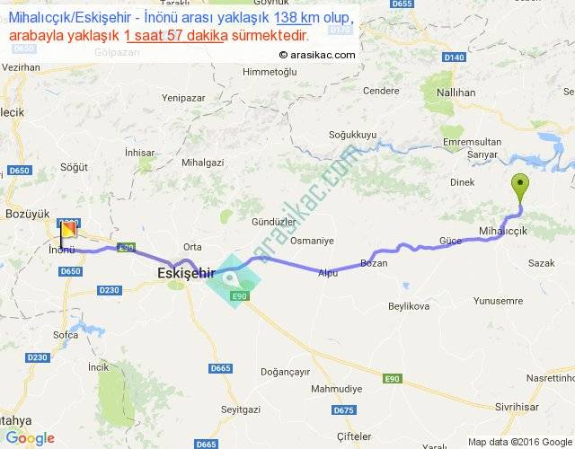 Mihalıcçık Eskişehir - İnönü arası yaklaşık olarak 90 km/h ile yukarıda belirtilen sürede olup, iki yerin kuş uçuşu uzaklığı (mesafesi) 119'dir. Yolculuk otobüsle 2 saat 32 dakika sürmektedir.
