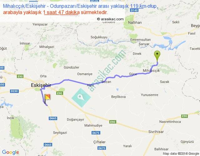 Mihalıcçık Eskişehir - Odunpazarı Eskişehir arası yaklaşık olarak 90 km/h ile yukarıda belirtilen sürede olup, iki yerin kuş uçuşu uzaklığı (mesafesi) 89'dir. Yolculuk otobüsle 2 saat 19 dakika sürmektedir.