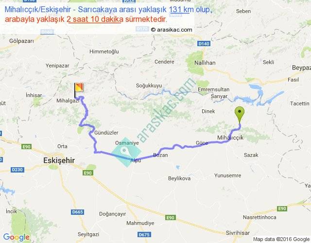 Mihalıcçık Eskişehir - Sarıcakaya arası yaklaşık olarak 90 km/h ile yukarıda belirtilen sürede olup, iki yerin kuş uçuşu uzaklığı (mesafesi) 80'dir. Yolculuk otobüsle 2 saat 49 dakika sürmektedir.