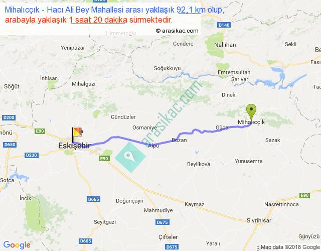 Mihalıcçık - Hacı Ali Bey Mahallesi arası yaklaşık olarak 90 km/h ile yukarıda belirtilen sürede olup, iki yerin kuş uçuşu uzaklığı (mesafesi) 83'dir. Yolculuk otobüsle 1 saat 44 dakika sürmektedir.