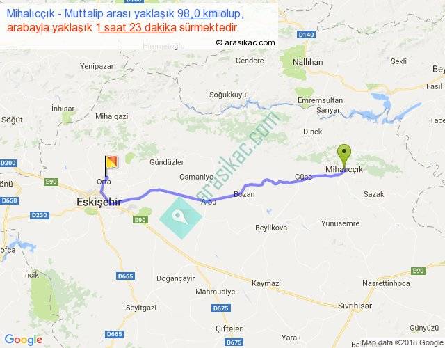 Mihalıcçık - Muttalip arası yaklaşık olarak 90 km/h ile yukarıda belirtilen sürede olup, iki yerin kuş uçuşu uzaklığı (mesafesi) 80'dir. Yolculuk otobüsle 1 saat 47 dakika sürmektedir.