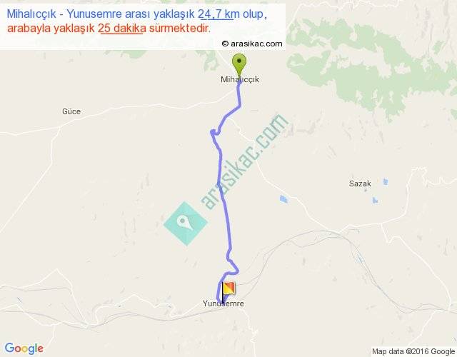 Mihalıcçık - Yunusemre arası yaklaşık olarak 90 km/h ile yukarıda belirtilen sürede olup, iki yerin kuş uçuşu uzaklığı (mesafesi) 18'dir. Yolculuk otobüsle 32 dakika sürmektedir.