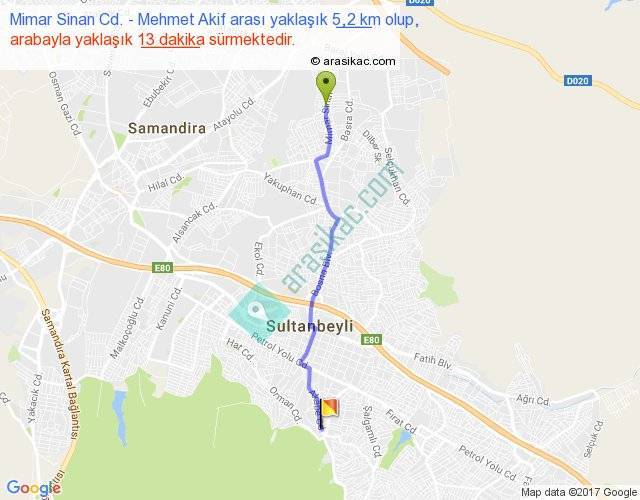 Mimar Sinan Cd. - Mehmet Akif arası yaklaşık olarak 90 km/h ile yukarıda belirtilen sürede olup, iki yerin kuş uçuşu uzaklığı (mesafesi) 5'dir. Yolculuk otobüsle 16 dakika sürmektedir.
