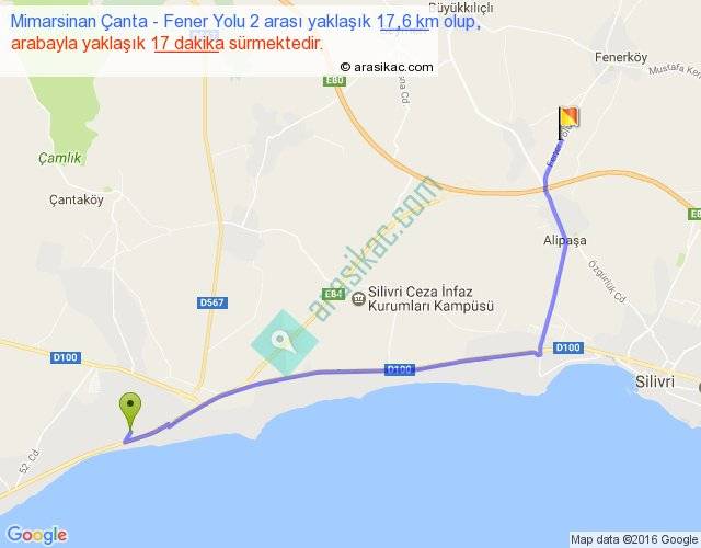Mimarsinan Çanta - Fener Yolu 2 arası yaklaşık olarak 90 km/h ile yukarıda belirtilen sürede olup, iki yerin kuş uçuşu uzaklığı (mesafesi) 14'dir. Yolculuk otobüsle 22 dakika sürmektedir.