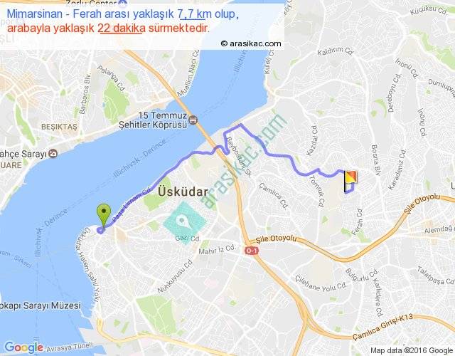 Mimarsinan - Ferah arası yaklaşık olarak 90 km/h ile yukarıda belirtilen sürede olup, iki yerin kuş uçuşu uzaklığı (mesafesi) 5'dir. Yolculuk otobüsle 28 dakika sürmektedir.