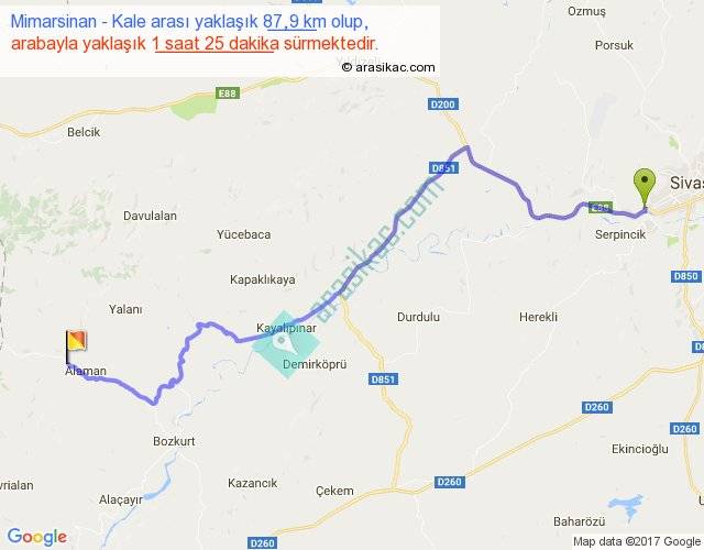 Mimarsinan - Kale arası yaklaşık olarak 90 km/h ile yukarıda belirtilen sürede olup, iki yerin kuş uçuşu uzaklığı (mesafesi) 64'dir. Yolculuk otobüsle 1 saat 50 dakika sürmektedir.