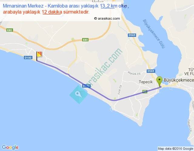 Mimarsinan Merkez - Kamiloba arası yaklaşık olarak 90 km/h ile yukarıda belirtilen sürede olup, iki yerin kuş uçuşu uzaklığı (mesafesi) 12'dir. Yolculuk otobüsle 15 dakika sürmektedir.